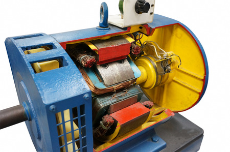 Opened electro motor with a copper coil and wire winding. Technology and industrial supply.