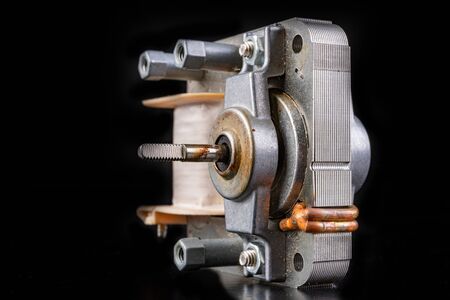 Small electric motor for the oven. Household appliance repair accessories. Dark background.