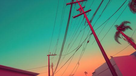 A striking photo capturing electric poles and utility wires intricately woven against a vibrant sunset sky. Silhouetted palm trees add depth and beauty.