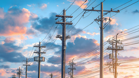 High-voltage pblems tower against the sky at sunset, power grid concept. High contrasting colors, stock photo, --chaos 30 --ar 16:9 --v 6.1 Job ID: fefbc0d2-9743-4ff9-b5c7-e09e92230f48