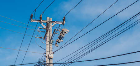 electricity post with blue sky background, power transmission equipment concept.