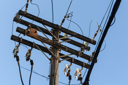 Wooden electricity pole with multiple power lines and glass insulators, set against a clear, vibrant blue sky. Selective focus.