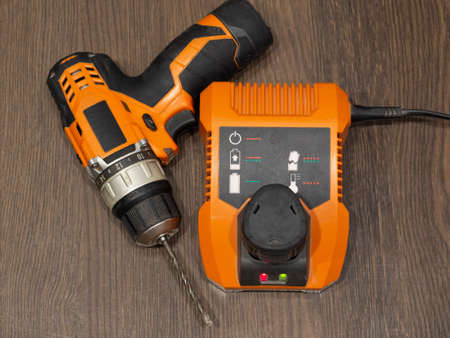 Battery for cordless drill. Screwdriver battery. Battery with a charge indicator lie on a wooden background