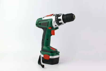 Green cordless hammer screwdriver drill on white background. The tool can be used as a drill hammer or a screwdriver or flat drill The drill has two speed an keyless chuck.