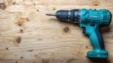 Modern cordless drill with a phillips head bit sits ready for use on a wooden workbench in a blurred workshop background, showcasing tools of the trade