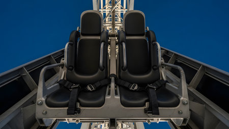 A low-angle view looking up at empty roller coaster seats hanging from a steel track against a deep blue sky. The industrial design and safety harnesses suggest anticipation and the thrill of amusement park rides.