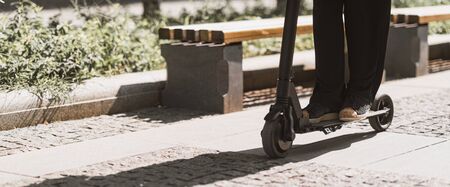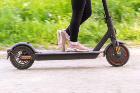 Legs of young woman on kick scooter at street.