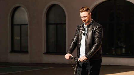 Modern man riding electric scooter in the city