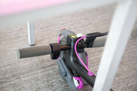 Folded electric scooter placed under a table. Practical and environmentally friendly transport system for urban life.