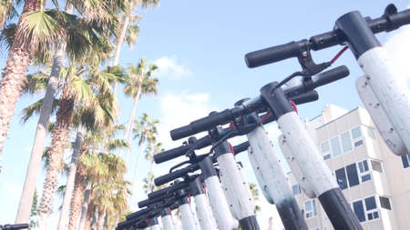 Row of rental electric scooters parked on street sidewalk, many palm trees in city near Los Angeles, California, USA. Shared e-scooters or bike for rent and ride, micromobility vehicle as transport.