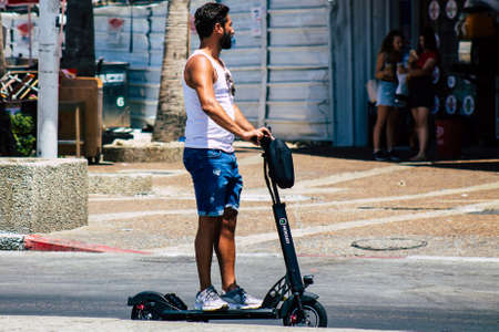 Tel Aviv Israel July 15, 2019 View of unknown Israeli people rolling with a electric scooter in the streets of Tel Aviv in the afternoon