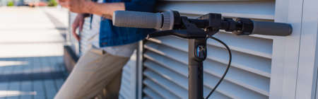 partial view of blurred man near e-scooter outside, banner