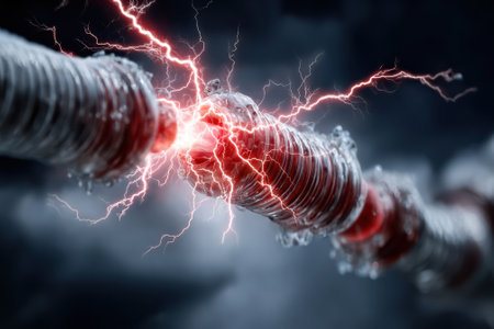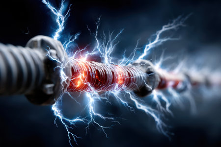Close-up of sparks flying from an exposed wire, capturing the moment of electrical discharge in vivid, high-energy detail