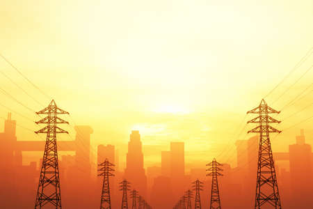 High Voltage Electric Poles and a Huge Smoggy Metropolis in the Sunset Sunrise 3D artwork illustration