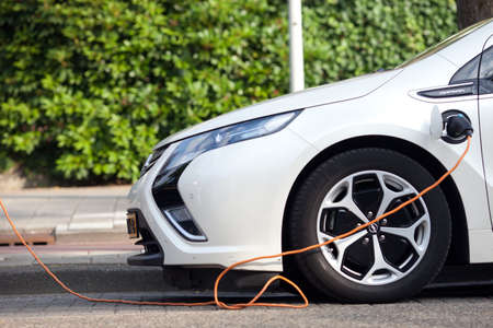 Electric car charging on the street. Electric vehicle charging station for electric cars.