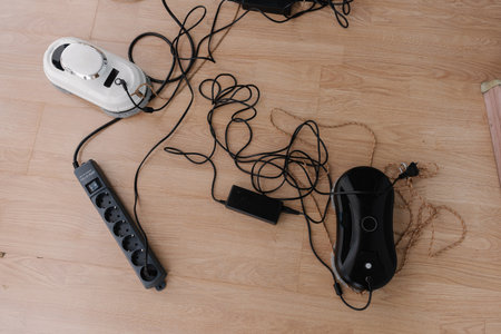 Two window cleaning robots resting on wooden floor, surrounded by tangled power supplies and cables, preparing for efficient and automated cleaning session indoors, no people, nobody.