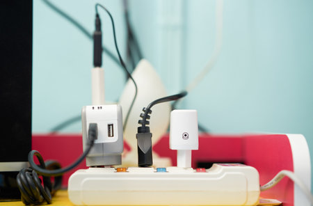 Top view of triple socket European power adapter with different wires at home. Standard electrical plug power outlet on blue background.