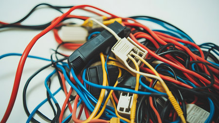 A captivating close-up image showcasing a tangled mixture of colorful electrical cables and wires, highlighting the chaos and complexity of technology.