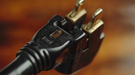 This image showcases a close-up view of a black electrical plug with shiny metal prongs, resting on a wooden surface. Perfect for technology themes.