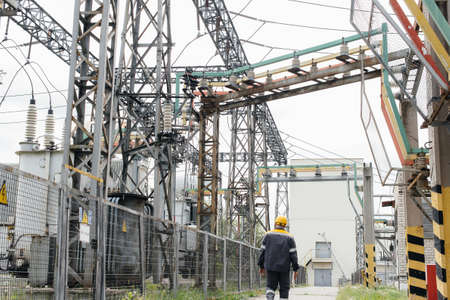 An engineering employee makes a tour and inspection of a modern electrical substation. Energy. Industry