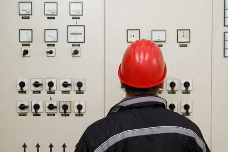 Electrician worker checking electricity meters. Electrical equipment. Background