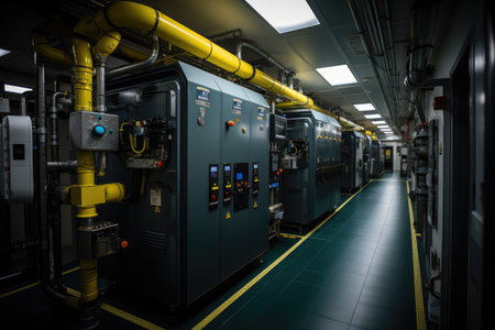 The inside of a large room with rows of electrical equipment. Generative AI.