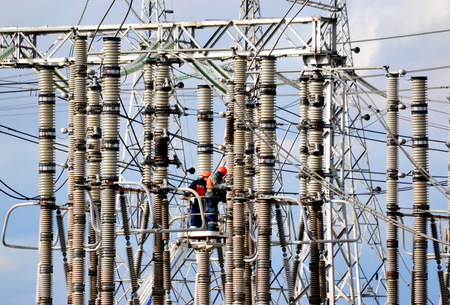 High voltage power line transmission tower workers with crane and blue sky. Hydro linemen on boom lifts working on high voltage power line towers.