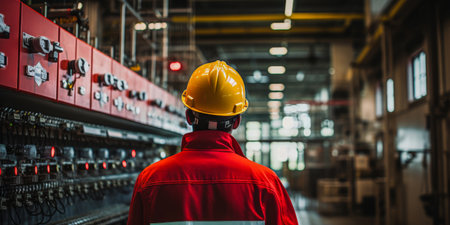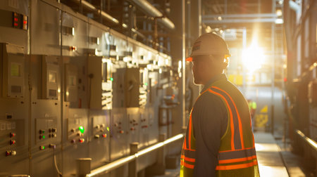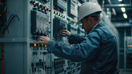 Engineer in hard hat operating control panel in industrial setting, technology concept