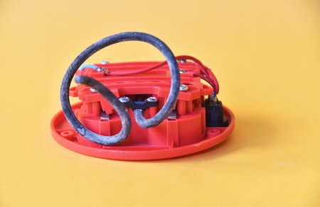 BALI,INDONESIA-AUGUST 09 2021: Used broken electric extension in red color with black cable on the color background