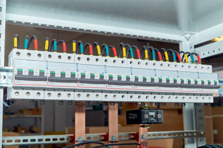 Electrical panel with multi-colored wires. Voltage distributor with circuit breakers. New automated system of electric power supply and distribution. Electric boxes with high-voltage equipment.