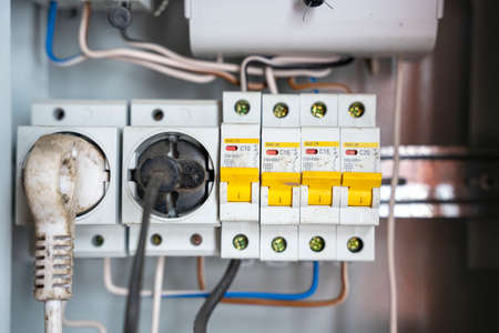 electrical panel with sockets and circuit breakers with wires