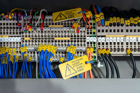 Electric wiring diagram of machinery in industrial factory. Terminal diagram with tag and warning label. High voltage electric wire. Automation machinery control panel. Electrical control cabinet.