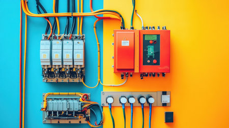 Electrical panel with colorful wires showing on blue and yellow wall background