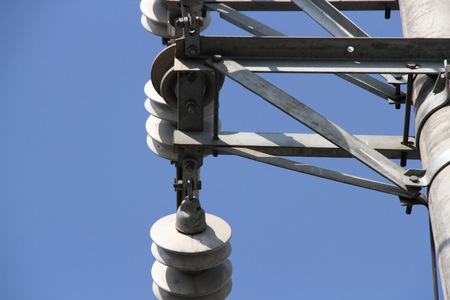 Close up of a large isolator on a power line for electric passenger trains. High quality photo