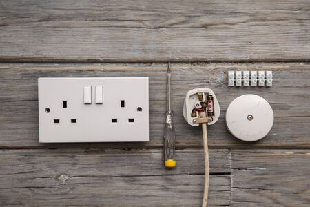 Electrical tools and equipment on a wooden background