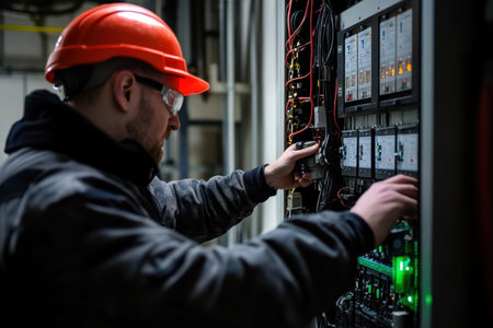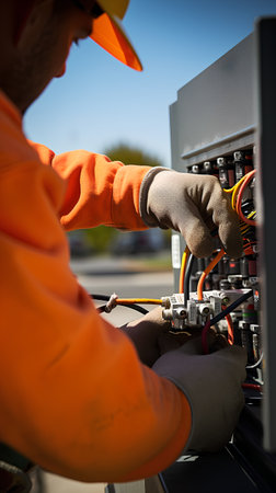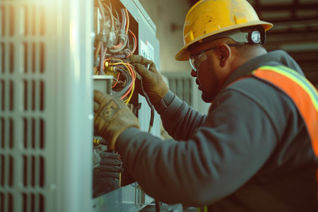 A dedicated electrician wearing a helmet and gloves works meticulously on power equipment. Safety gear ensures protection in an industrial environment.