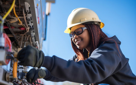Black woman technician in a hard hat and gloves meticulously working on complex industrial electrical control panel, ensuring precision and safety.
