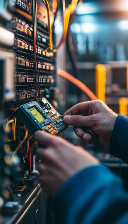Electrician using multimeter to inspect electrical panel in warm industrial lighting
