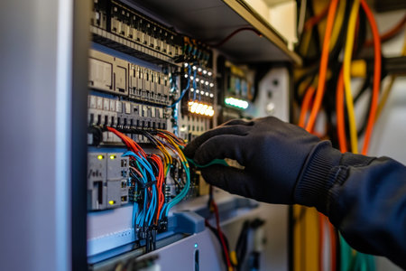 Electrician wearing protective gloves is carefully connecting cables and components within an electrical panel, ensuring safety and proper functionality