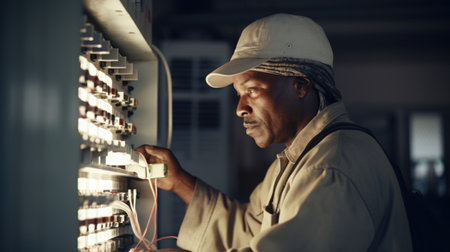 Electrician Male African-American Middle-Aged Installing and repairing electrical systems and equipment in Commercial building. Generative AI AIG22.