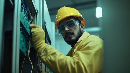 Professional electrician wearing safety gear examines and repairs intricate electrical wiring