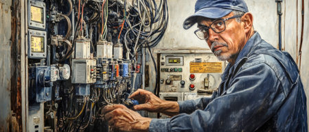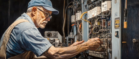 Skilled electrician focused on connecting wires in a bustling workshop, embodying craftsmanship and dedication amidst tools and machinery.
