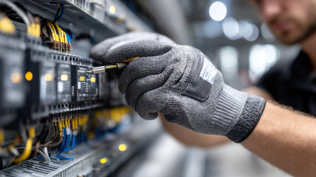 Electrician wearing gloves working on an electrical panel and tightening screws with a screwdriver