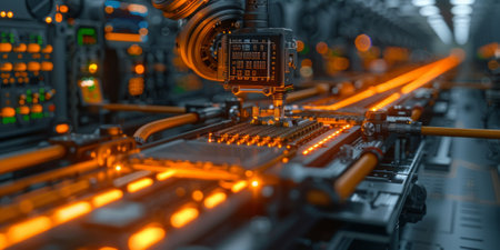 Futuristic factory uses automated machinery to produce computer chips at night generated by artificial intelligence