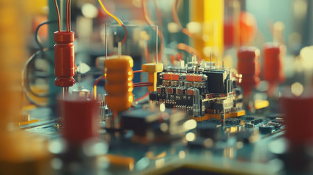 An electronic circuit board and various components are showcased, illuminated by a combination of red and blue light. The image highlights a complex arrangement of wires, panels, and equipment, indicating a possible laboratory or workshop setting. This composition may be suitable for illustrating technology, innovation, or research concepts in commercial contexts.