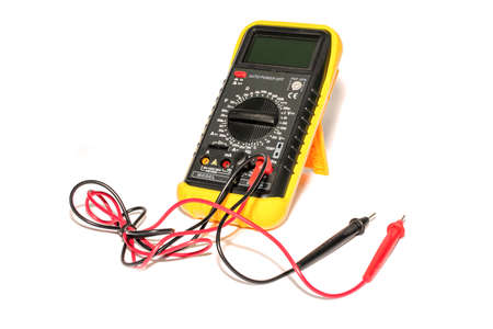 Yellow multimeter. Electronic measuring device. The multimeter measures voltage, current, and resistance. Used
