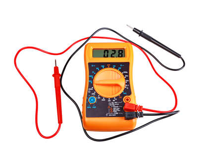 Digital multimeter with switch and probes. Measurement electrician tool closeup on white background