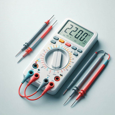 Digital Multimeter on Blue Background with Red and Black Probes for Electrical Measurement