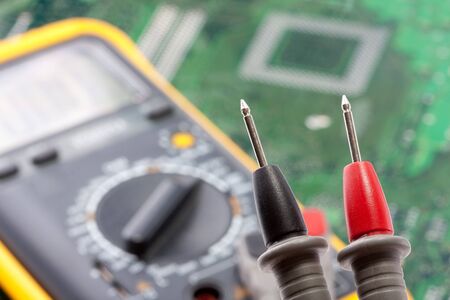 Close-up of digital multimeter on wooden background, Worker used electronic tools for checked circuit, Special tools on electronic job.