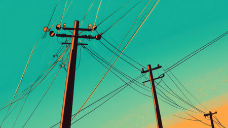 An artistic representation of telephone poles and power lines against a vivid sunset sky, merging urban infrastructure with nature's beauty in a stunning visual composition.